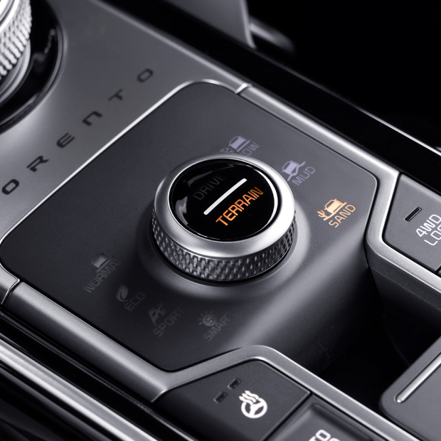 Благодаря системе адаптации к дорожным условиям (Terrain Mode) Sorento обеспечивает плавную езду на любых дорожных покрытиях (режимы SNOW — снег, MUD — грязь, SAND — песок).