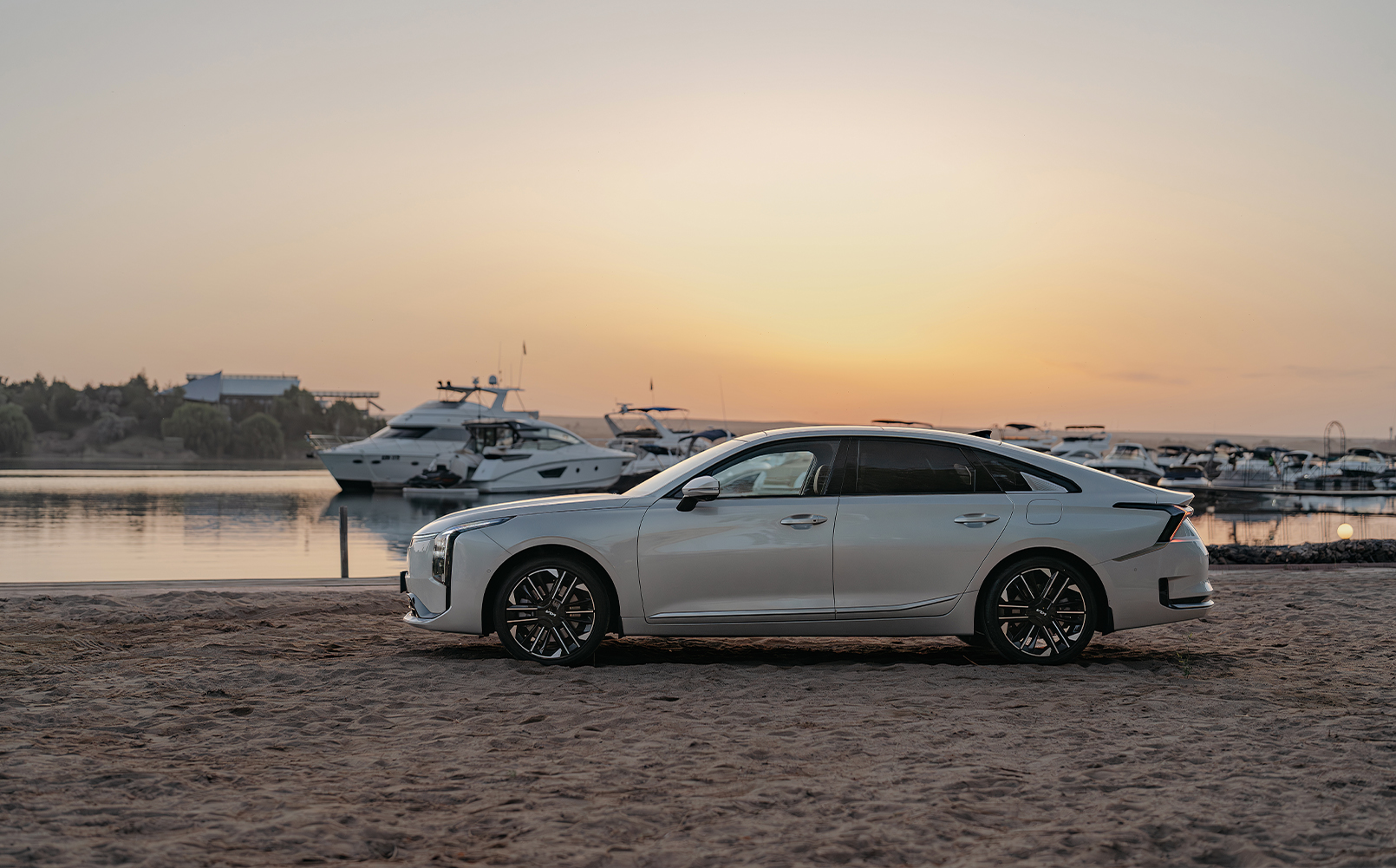 Облик Kia K8 воплощает философию дизайна бренда «Единство противоположностей» (Opposites united). Передняя часть выполнена в единой стилистике с флагманской электрической моделью – EV9, получившей множество наград в самых разных регионах мира, и другими новейшими моделями Kia. Вертикально ориентированные фары, светодиодная линия ходовых огней и образующая с ними единый контур сплошная световая полоса по всей ширине кузова придают автомобилю не просто современный, а футуристичный облик. В профиль К8 выглядит максимально элегантно благодаря гармоничным пропорциям и изящному силуэту, которые дополняет динамичный дизайн колесных дисков. Массивные и внушительные бамперы (передний – с активными заслонками радиатора) добавляют седану выразительности, подкрепляя впечатление уверенности и современности. Задняя часть К8 гармонично завершает стильный и уверенный образ. Яркими элементами дизайна здесь стали горизонтальные хромированные элементы вытянутой формы и задние фонари в концепции «Звездная карта», перекликающиеся с передней светотехникой. Водителя встречает нарядная и стильная «приветственная подсветка». Система динамической подсветки включает в себя передние фары, габаритные огни и задние фонари. Она предлагает три различных динамических режима работы, которое одновременно привлекают внимание и подчеркивают стильный дизайн автомобиля.