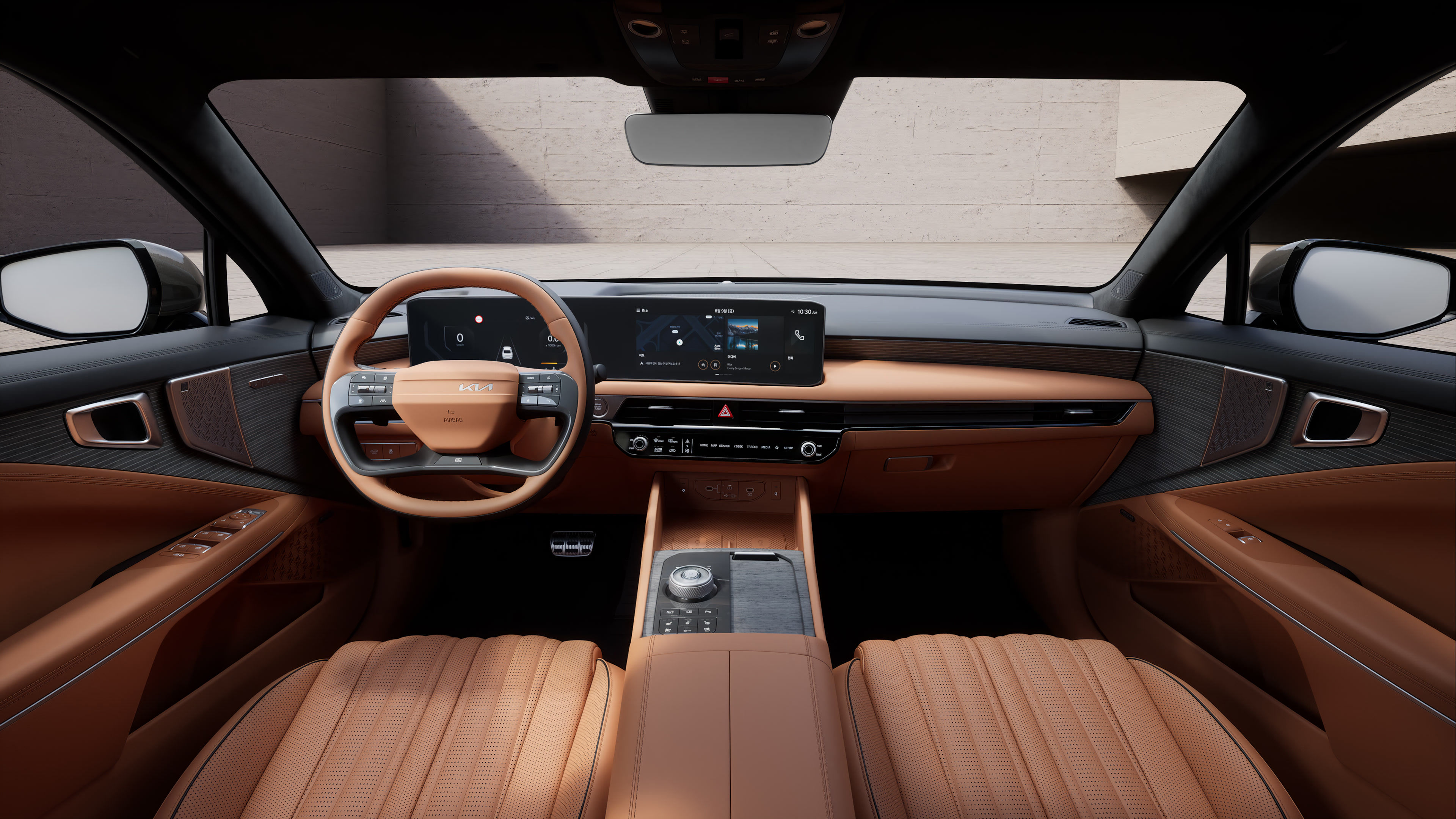 Одним из ключевых элементов дизайна интерьера стал большой изогнутый панорамный дисплей, в который интегрированы цифровая панель приборов (диагональю 12,3”) и экран информационно-развлекательной системы (12,3”). Декоративные накладки передней панели выглядят особо эффектно благодаря фирменному дизайну Geonic, в темное время суток на передней панели и в других зонах салона можно включить динамическую атмосферную подсветку. Рулевое колесо нового для Kia дизайна имеет двухцветную отделку и оборудовано емкостными датчиками присутствия рук на руле – наличие функции HoD (система контроля присутствия рук на руле) способствует повышению безопасности. Центральный подлокотник с двумя створками, впервые для моделей Kia, имеет подогрев (работает в паре с подогревом сидений) и систему ультрафиолетовой стерилизации внутреннего отсека.